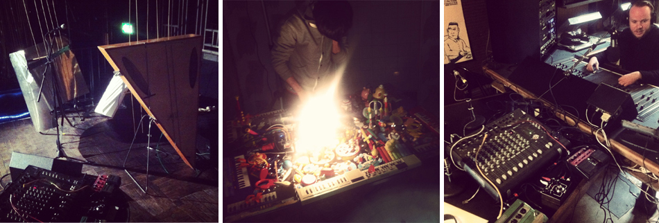 A photo from the long jams in Berlin together with Bob Rutman. In the middle one from the show in Antwerp, where i shared the space at Stadslimiet with Asuna. On the right there is our Mc Dennis Radio Tyfus at Radio Centraal where i played two live sessions during his online program. Soon or later on podcast.