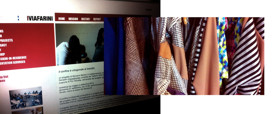 A project by Giovanni Morbin with Canedicoda, Modou Gueye, Dimenava Kouyate, Mouhamadou Ndiaye, Mor Ndiaye, Aliou Diop, Maabsa Gassama, Hassan Aftis, Cheik Thioune, Balla Nar Ndiaye, Mame Diba Diop, Dieynaba Kouyate, Aliou Ndiaye, Rufin Doh, Seydi Diougouna, Birane Gueye, Francesco Bertocco, Christophe Fellai, Alan Chies, Gabriele Grotto, Cyril Delachaux, Peter Schreuder, produced by Viafarini DOCVA (Patrizia Brusarosco, Simone Frangi, Giulio Verago) and ECAV Ecole Cantonale d’Art du Valais (Sibylle Omlin, Federica Martini) with the support of Pro Helvetia (Viavai – Contrabbando culturale Svizzera-Lombardia). Thanks to Bonotto spa and Marsèll. September 21st 2014, Sempione – Confine di stato.