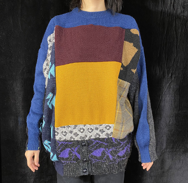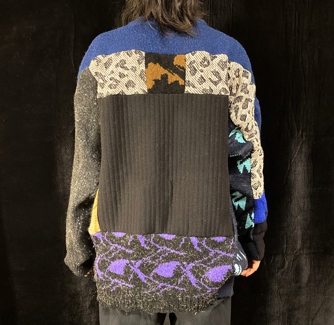 WNG.349 Hand-hassembled collage from different second-hand pullovers. Always kindly and one of a kind, from 2010: the Wings serie. Unisex size (S/M). NOT AVAILABLE 0.00 euro - < Back to Shop