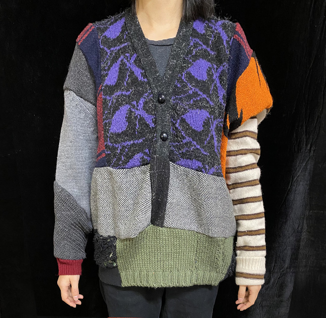 WNG.352 Hand-hassembled collage from different second-hand pullovers. Always kindly and one of a kind, from 2010: the Wings serie. Unisex size (S/M). NOT AVAILABLE 0.00 euro - < Back to Shop