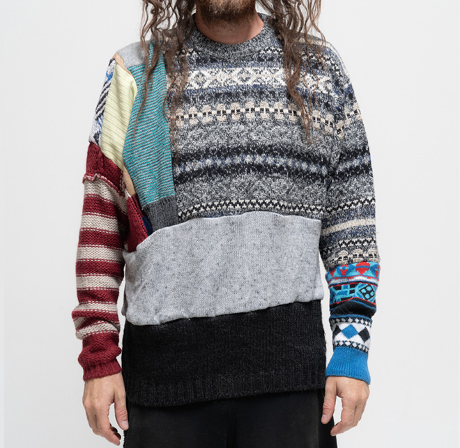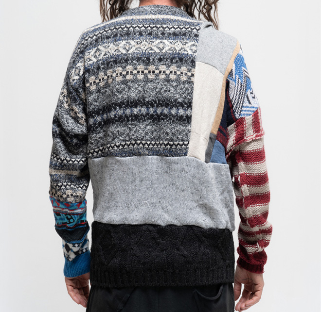 WNG.444 Hand-hassembled collage from different second-hand pullovers. Always kindly and one of a kind, from 2010: the Wings serie. Unisex size (L/XL). One size 130.00 euro Size : One Size < Back to Shop