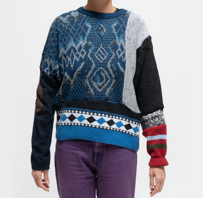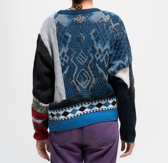 WNG.453 Hand-hassembled collage from different second-hand pullovers. Always kindly and one of a kind, from 2010: the Wings serie. Unisex size (S/M). One size 130.00 euro Size : One Size < Back to Shop