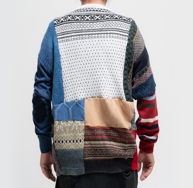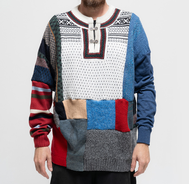 WNG.454 Hand-hassembled collage from different second-hand pullovers. Always kindly and one of a kind, from 2010: the Wings serie. Unisex size (L/XL). One size 130.00 euro Size : One Size < Back to Shop