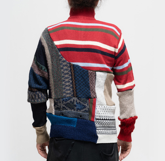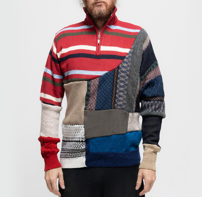 WNG.458 Hand-hassembled collage from different second-hand pullovers. Always kindly and one of a kind, from 2010: the Wings serie. Unisex size (L/XL). One size 130.00 euro Size : One Size < Back to Shop